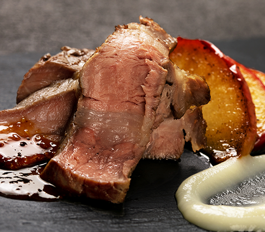 きめが細かく、脂の融点が低いので口の中でサラリと溶け、あと味がさっぱりしているマンガリッツア豚と、赤身部分に力強い肉質を持つデュロック豚を掛け合わせることで、きれいな赤身と脂のバランスを実現し日本人好みの肉質に仕上げました。これまでにない「甘味、食感、香り」を感じていただけます。デュロック豚:アメリカ原産の茶系の豚。赤身部分に力強さがある濃い味
